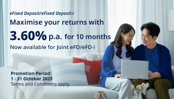 3) Starting 5 March 2025, Joint eFD/eFD-i will be available for 2 account holders with operating mandate of either 1-to-sign. Check the eligibility requirements and account opening step-by-step guide at our eFixed Deposit/eFixed Deposit-i product page.